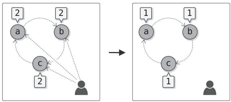 a = b = c = None上面的代码与之前的代码几乎相同,唯一的区别是这次增加了一个从c到a的引用。这时,3个对象呈环状相互引用。这种状态就是循环引用。a、b、c之间的关系如图17-2所示。