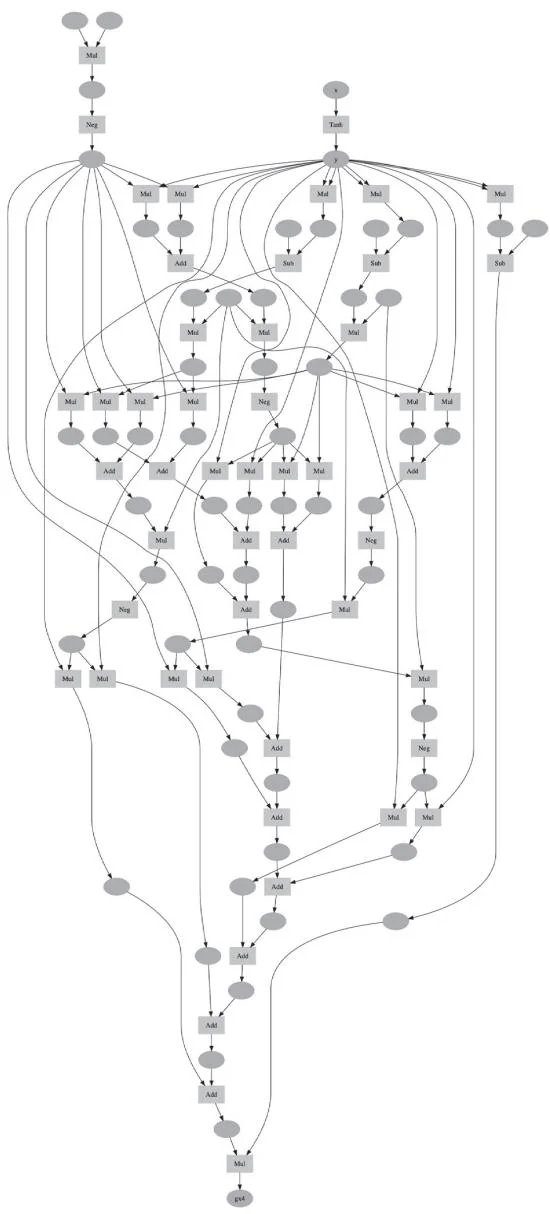 图16-5 连接方式更加复杂的计算图的例子(步骤35中实际创建的y = tanh(x)的四阶导数的计算图)