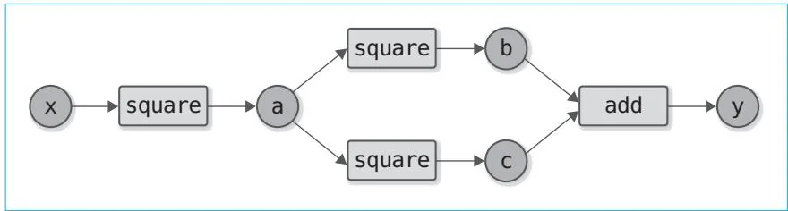 我们终于可以处理复杂的计算图了。图16-4所示的计算图比较简单,但其实DeZero已经可以对连接方式比较复杂的计算图求导了,比如图16-5这样的计算图。