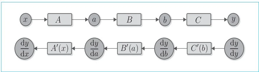 从图5-5可以看出,正向传播和反向传播之间存在明确的对应关系。例如,正向传播时的变量 对应于反向传播时的导数 。同样, 对应于 , 对应于 。我们也可以看出函数之间存在对应关系。例如,函数 的反向传播对应于 , 对应于 。这样一来,我们可以认为变量有普通值和导数值,函数有普通计算(正向传播)和求导计算(反向传播)。于是,反向传播就设计好了。