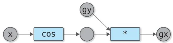 图31-2中的计算图用于求sin函数的导数。该图以计算图的形式展示了前面Sin类的反向传播的代码 。对于图31-2这样的计算图,我们可以通过调用gx.backup()求出gx对x的导数。由于gx本来就是 的导数,所以调用gx.backup()可以对x再次求导,也就是求x的二阶导数。