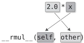 基于以上分析,我们知道只要实现__rmul__方法就可以解决这个问题。这时,参数会按照图21-1的方式传给__rmul__方法。