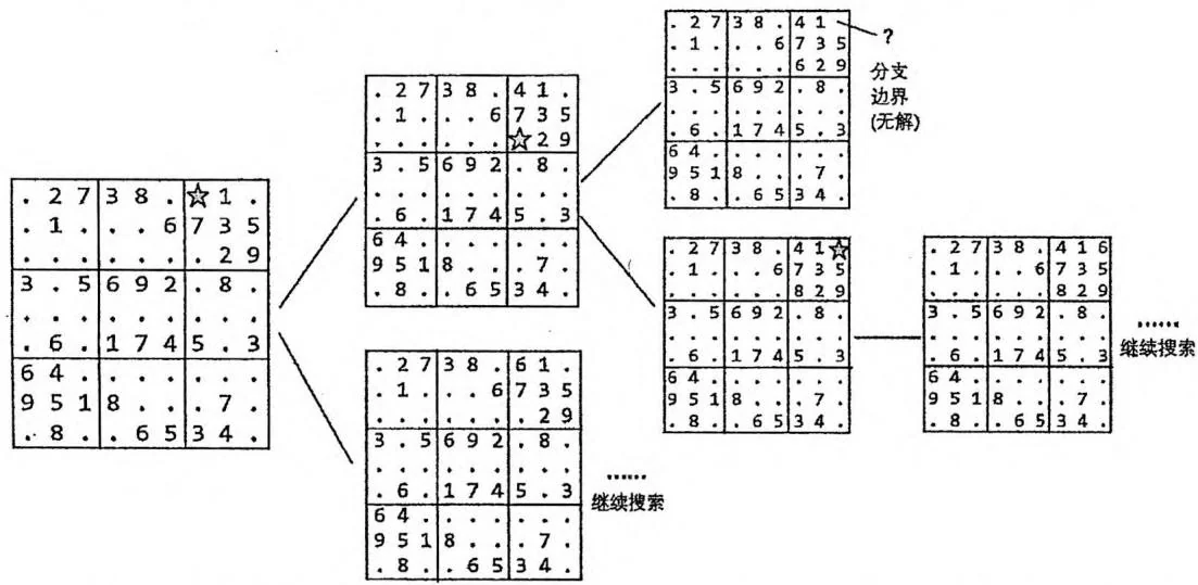 如下图所示,就是用深度优先搜索算法求解Sudoku问题产生的一棵搜索树。