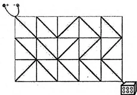 电路板的整体结构是一个 RRCC 列的网格,如右图所示。每个格点都是电线的接点,每个格子都包含一个电子元件。电子元件的主要部分是一个可旋转的、连接一条对角线上的两个接点的短电缆。在旋转之后,它就可以连接另一条对角线的两个接点。电路板左上角的接点接入直流电源,右下角的接点接入飞行车的发动装置。
