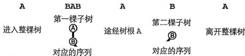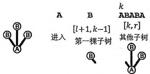 读者可能会想到,把子串 S[lr]S[l \sim r] 分成两部分,每部分可由若干棵子树组成。不过这样可能会产生重复计数。如果每段可以由多棵树树构成,那么划分方案“A|BAB|A|B|A”和“A|B|A|BAB|A”中的“BAB”都能产生“B|A|B”两棵树树,最终归为同一结果——方案5。
