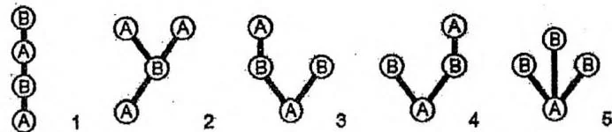 例如序列“ABABABA”对应5种金字塔结构,最底部是树根。我们认为子树之间是有序的,所以方案3和4是两种不同的方案。如下页图所示。
