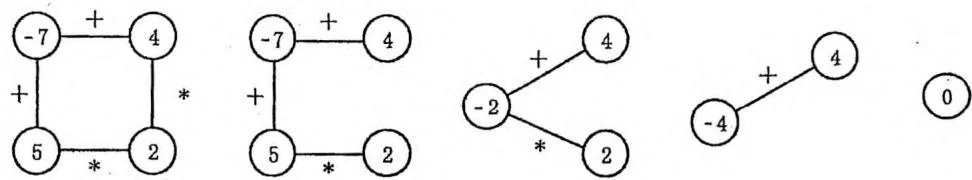第一步, 玩家需要选择一条边, 将它删除。接下来再进行 N1N - 1 步, 在每一步中, 玩家选择一条边, 把这条边以及该边连接的两个顶点用一个新的顶点代替, 新顶点上的整数值等于删去的两个顶点上的数按照删去的边上标有的符号进行计算得到的结果。如下图所示, 就是一盘游戏的过程。