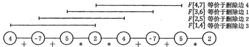 在枚举第一步删除哪条边后,这道题就与上一题“石子合并”非常相似,仍然是在每一步中对两个相邻的元素做某种运算合成一个。简便起见,我们把被删除的边逆时针方向的顶点称为“第1个顶点”,依此类推。读者容易想到使用 F[l,r]F[l, r] 表示把第 llrr 个顶点合成一个顶点后,顶点上的数值最大是多少。