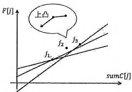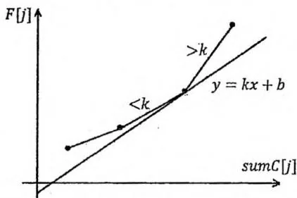 对于任意三个决策点 , 和 ,不妨设 ,因为 均为正整数,亦有 。根据“及时排除无用决策”的思想,我们来考虑 有可能成为最优决策的条件。
