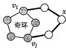 设 v-DCC 中的奇环依次由节点 构成, 为奇数。容易发现,对于奇环以外的任意节点 ,奇环上必然存在两点 ,满足 三个点都在某个简单环上。否则我们就有办法删除环上的一个点,让 与奇环不连通。