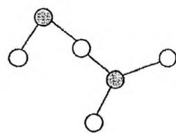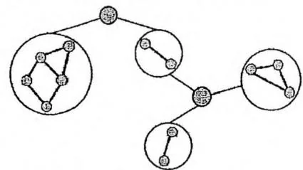 v-DCC的缩点比e-DCC要复杂一些——因为一个割点可能属于多个v-DCC。设图中共有 个割点和 个v-DCC。我们建立一张包含 个节点的新图,把每个v-DCC和每个割点都作为新图中的节点,并在每个割点与包含它的所有v-DCC之间连边。容易发现,这张新图其实是一棵树(或森林),如下图所示: