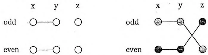 把每个变量 拆成两个节点 和 ,其中 表示 是奇数, 表示 是偶数。我们也经常把这两个节点称为 的“奇数域”和“偶数域”。