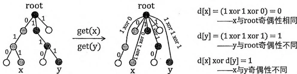 先检查 和 是否在同一个集合内(奇偶关系是否已知)。get(x)、get(y) 都执行完成后, 即为 和 的奇偶性关系(如下图)。若 (该关系与回答矛盾),则在该问题之后即可确定小 A 撒谎。
