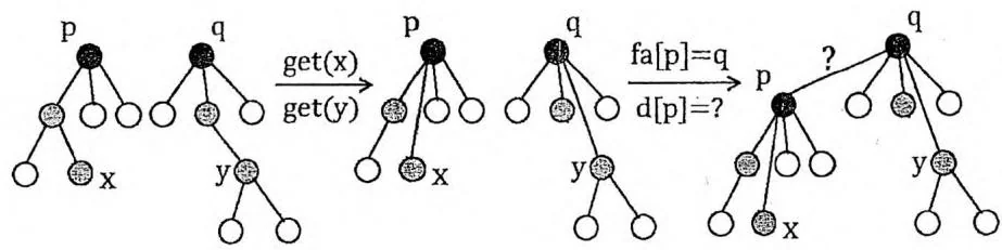 两个集合的树根(设为 和 ),令 为 的子节点。如下图所示。已知 与 分别表示路径 与 之间所有边权的“xor和”, 之间的边权 是待求的值。显然,路径 由路径 , 与 组成,因此 与 的奇偶性关系 。进而推出新连接的边权 。
