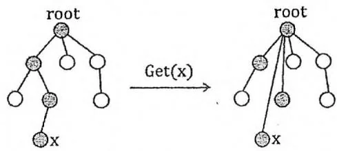 因此,我们可以在每次执行Get操作的同时,把访问过的每个节点(也就是所查询元素的全部祖先)都直接指向树根,即把上图中左边那棵树变成右边那棵。这种优化方法被称为路径压缩。采用路径压缩优化的并查集,每次Get操作的均摊复杂度为 。