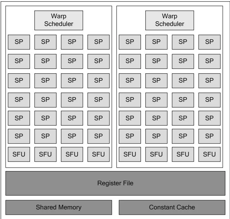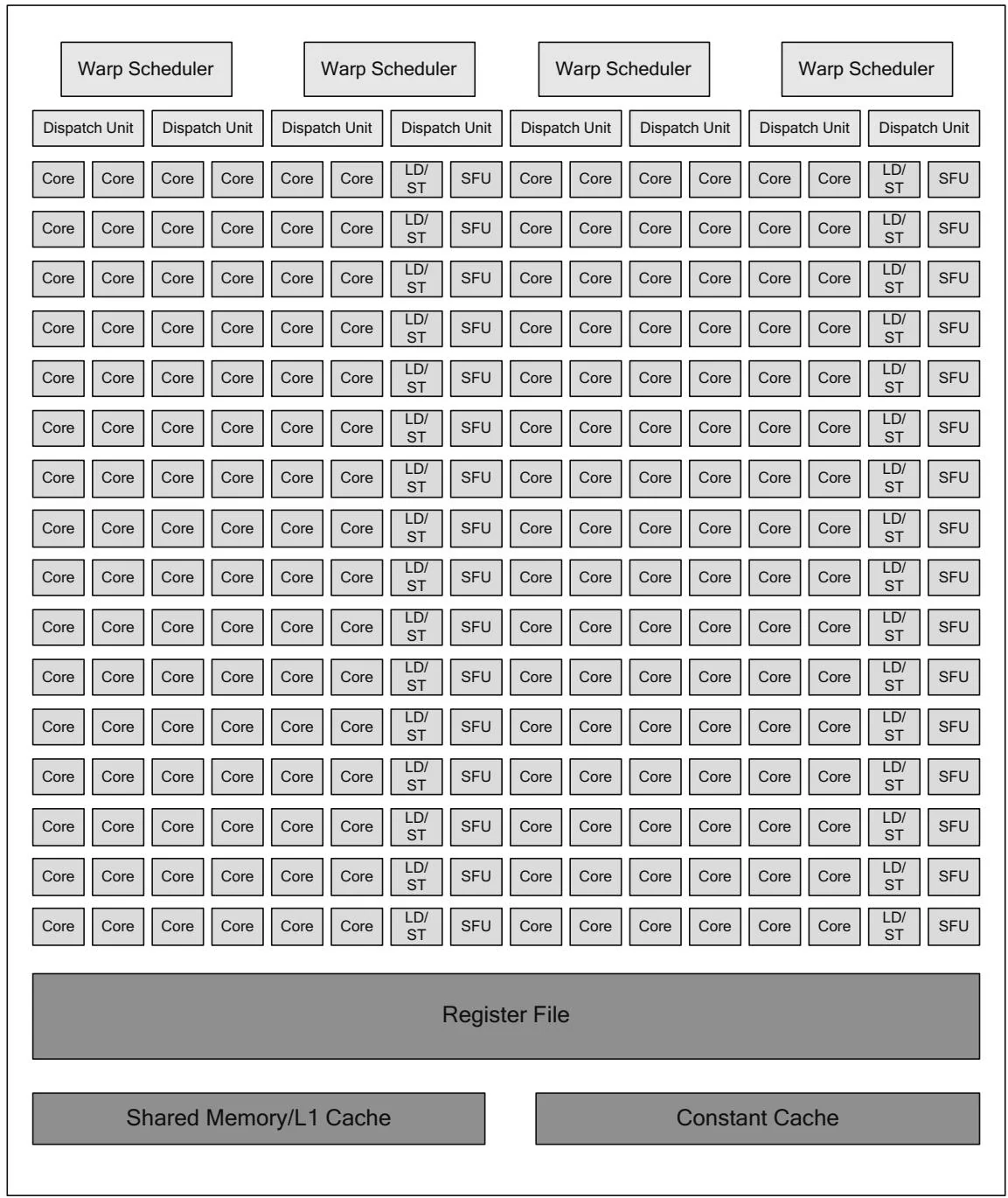 Figure 2.32 shows the most recent (as of this writing) streaming multiprocessor design, featured in the newest Kepler-class hardware from NVIDIA. This design is so different from previous generations that NVIDIA calls it "SMX" (next-generation SM). The number of cores is increased by a factor of 6 to 192,