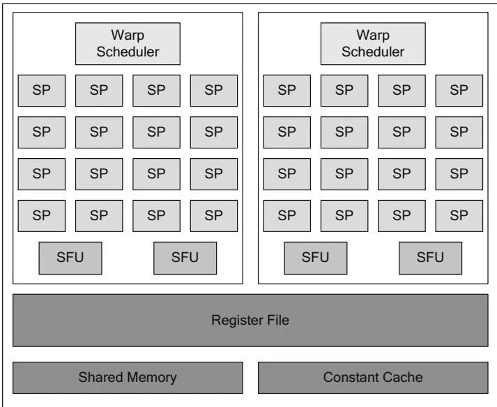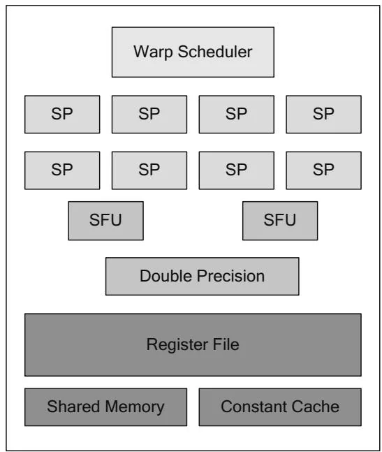 Figure 2.29 shows a Tesla-class streaming multiprocessor (SM 1.x). It contains 8 streaming processors that support 32-bit integer and single-precision floating-point arithmetic. The first CUDA hardware did not support double precision at all, but starting with GT200, the SMs may include one double-precision floating-point unit.[17]