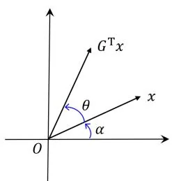 GTx=[cosθsinθsinθcosθ]T[rcosαrsinα]=[r(cosθcosαsinθsinα)r(sinθcosα+cosθsinα)]=[rcos(α+θ)rsin(α+θ)],G ^ {\mathsf {T}} x = \left[ \begin{array}{c c} \cos \theta & \sin \theta \\ - \sin \theta & \cos \theta \end{array} \right] ^ {\mathsf {T}} \left[ \begin{array}{c} r \cos \alpha \\ r \sin \alpha \end{array} \right] = \left[ \begin{array}{c} r (\cos \theta \cos \alpha - \sin \theta \sin \alpha) \\ r (\sin \theta \cos \alpha + \cos \theta \sin \alpha) \end{array} \right] = \left[ \begin{array}{c} r \cos (\alpha + \theta) \\ r \sin (\alpha + \theta) \end{array} \right],