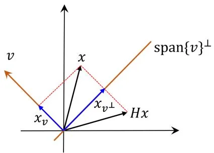 HxHxxxspan{v}\operatorname{span}\{v\}^{\perp} 方向有着相同的分量, 而在 vv 方向的分量正好相差一个符号. 也就是说, HxHxxx 关于超平面 span{v}\operatorname{span}\{v\}^{\perp} 的镜面反射, 见图3.1. 因此, Householder变换也称为Householder反射或反射变换.