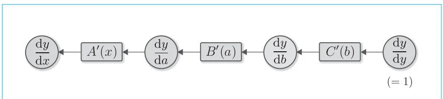 下面仔细观察图5-3。我们先从 dydy(=1) 开始,计算它与 dbdy 的乘积。这里的 dbdy 是函数 y=C(b) 的导数。因此,如果用 C′ 表示函数 C 的导函数,我们就可以把式子写成 dbdy=C′(b) 。同样,有 dadb=B′(a) , dxda=A′(x) 。基于以上内容,图5-3可以简化成图5-4。
