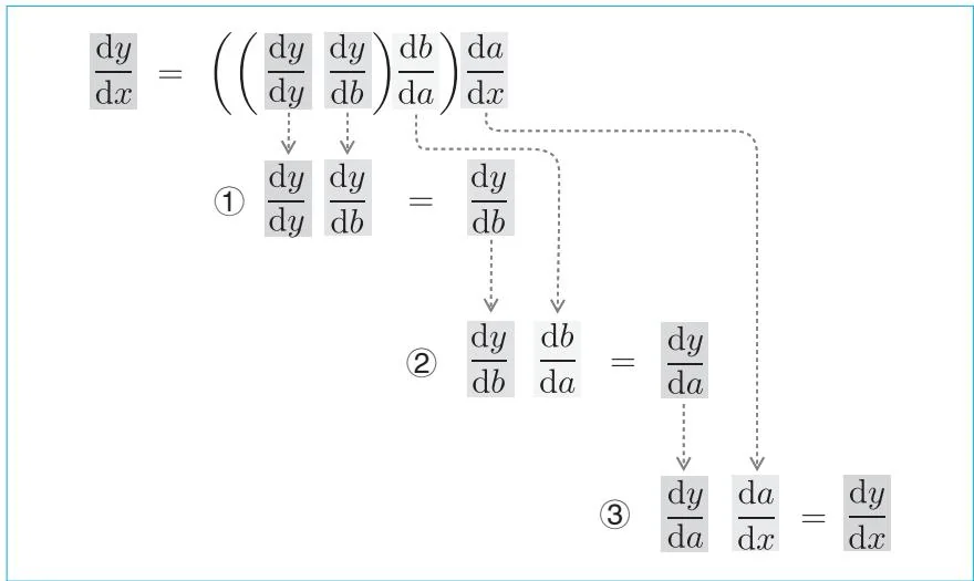 下面仔细观察式子5.2。式子5.2表示复合函数的导数可以分解为各函数导数的乘积。但是,它并没有规定各导数相乘的顺序。当然,这一点我们可以自由决定。这里,我们按照式子5.3的方式以输出到输入的顺序进行计算①。