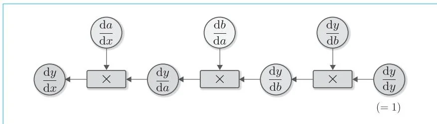 dxdy=((dydydbdy)dadb)dxda(5.3) 式子5.3按照从输出到输入的顺序进行导数的计算,计算方向与平时相反。这时,式子5.3的计算流程如图5-2所示。