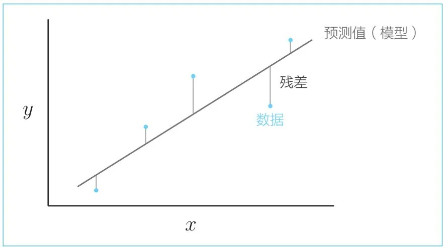 如图42-2所示,我们的目标是找到一条拟合数据的直线 。为此,我们需要尽可能地减小数据和预测值之间的差,这个差叫作残差(residual)。下面是表示预测值(模型)和数据之间的误差指标的式子。