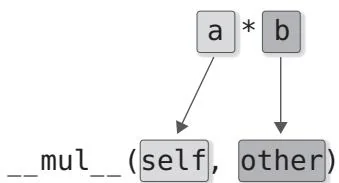 上面的代码成功实现了 y=aby = a * b 的计算。当执行 aba * b 时,实例a的__mul__(self, other)方法被调用。这时,运算符*左侧的a作为self参数、右侧的b作为other参数传给了__mul__方法,具体如图20-2所示。