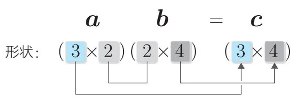 图41-2展示了由 3×23 \times 2 矩阵 a\mathbf{a}2×42 \times 4 矩阵 b\mathbf{b} 的乘积得到 3×43 \times 4 矩阵 c\mathbf{c} 的例子。如图所示,矩阵 a\mathbf{a} 和矩阵 b\mathbf{b} 的相应维度(轴)中的元素数量必须相同。得到的矩阵 c\mathbf{c} 的行数是矩阵 a\mathbf{a} 的行数,列数是矩阵 b\mathbf{b} 的列数。